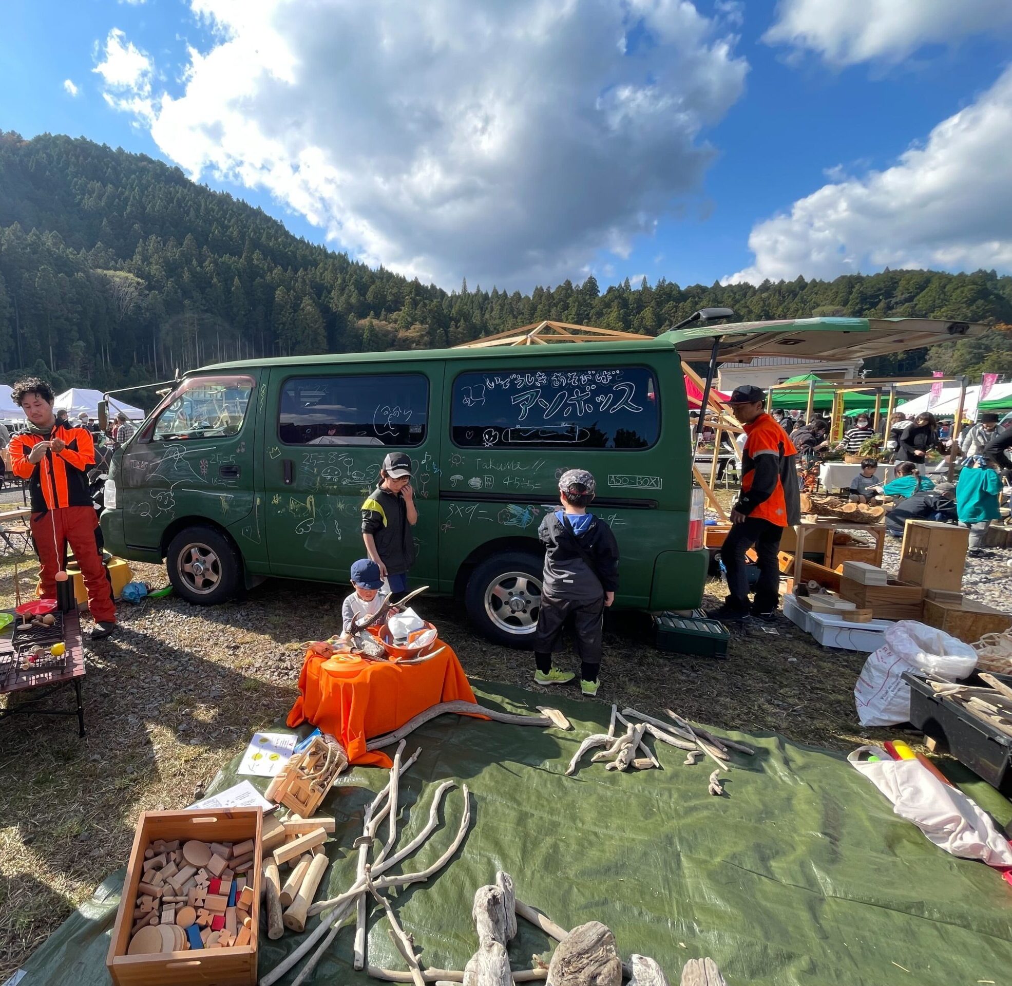 そんな中、多田さんが強く惹かれたのが、豊田市中山間地域の豊富な森林資源でした。「しかし、都市と山間部が共存する恵まれた環境にありながら、豊田市の都市部に暮らす人たちはそれを享受できていないのではないのか」と感じた多田さんは、子どもたちに原体験としての自然遊びを届けたい!との思いから、『ぼーぼーあそぼープロジェクト』をスタート。ワンボックスカーに森の素材や木製遊具を搭載して街へと届ける移動式遊び場「ASO-BOX」や、棒を使った108通りの遊びをイラストだけで表現し、ひらめきや創造力を促すインスピカードの制作販売。そして、地域連携による教育などの取り組みを通して、人と森をつなぎ直し、地域の森林資源への新たな価値の創造や、林業・木工産業の活性化を図りたいと邁進しています。